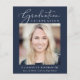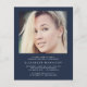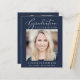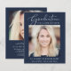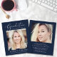Elegante chica amigable con el presupuesto, invitación de graduación azul oscuro e invitación de fiesta con "Celebración de la Graduación" en un elegante guión blanco y tipografía blanca, su foto y su nombre, colegio y año de clase en una simple y moderna tipografía blanca. En la parte de atrás, agregue otra foto y los detalles de la fiesta de graduación.