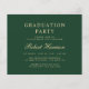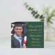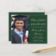 Moderna invitación de graduación de la universidad verde amigable con el presupuesto y invitación a la fiesta con una foto del graduado, su nombre y año de clase con un elegante guión dorado ligero y su universidad, especialidad y honores. En la parte posterior, agregue los detalles del fiesta de grado.