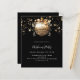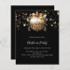 Una invitación para un Fiesta de Navidades. Un fondo negro. Decorada con una gran cosecha dorada que parece bauble y estrellas doradas. Personalice y agregue los detalles. Texto blanco. 1 hoja = 1 borde impreso de invitación al borde.