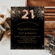 Una invitación moderna, elegante y glamurosa para un fiesta de 21 años. Un fondo negro decorado con un falso purpurina. El nombre está escrito con un guión moderno de estilo con letras a mano de colores dorados. Personalice y agregue los detalles de su fiesta. El número 21 se escribe con un tipo de letra, guión.