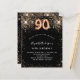 Una invitación moderna, elegante y glamurosa para una fiesta de cumpleaños número 90. Un fondo negro decorado con un falso purpurina. El nombre está escrito con un guión moderno de estilo con letras a mano de colores dorados. Personalice y agregue los detalles de su fiesta. El número 90 se escribe con un tipo de letra, guión.