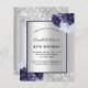 Un fondo falso plateado adornado con flores azul marino y azul claro y purpurinas falsos de plata, chispas. Personalice y agregue su nombre y detalles del fiesta. Cartas negras.