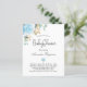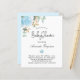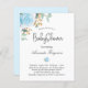 Para un Baby Shower, celebrando a un bebé. Un fondo blanco moda. Decoradas con rosas de color azul claro, flores, flores y vegetación de eucalipto verde, hojas, una primavera dorada. Personalice y agregue un nombre y detalles del fiesta. El texto: Baby Shower y el nombre de la madre a ser están escritos con una escritura de estilo con letras a mano moderna. Atrás: color de fondo azul claro.