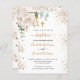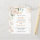 Por el bautismo de dos niños. Un fondo blanco adornado con vegetación eucalipto, una rosa blanca, hojas doradas y purpurinas de imitación dorada. Personalizar y los nombres de los niños y detalles de la ceremonia. Letras de color negro y dorado. Neutralidad de género. Parte posterior: fondo blanco con gotas purpurinas falsas doradas