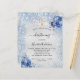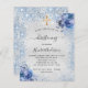Un bautismo moderno y elegante, celebrando a un bebé. Un fondo de color falso plateado decorado con falsos purpurinas y flores azules. Una cruz dorada. Personalice y agregue un nombre y detalles del fiesta. Letras de color negro.