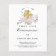 Muy bonito La invitación a la Primera Comunión incluye una cruz de oro rodeada de rosas rosas rosas rosas y salsas hojas verdes. Las fuentes tradicionales le dan a esta invitación un aspecto clásico.