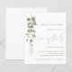 Invitación a la fiesta nocturna del Boda del Eucalipto del presupuesto. Una alternativa de valor por dinero BUDGET en un tamaño menor de 4,5 x 5,6" de peso semibrillante de 110 libras, que es de espesor similar al de una postal (sin embargo, no es adecuado para usar como postal). POR FAVOR, TENGA EN CUENTA QUE HAY UNA invitación por hoja. Un estilo botánico Minimalista que invita a los bodas de noche, con tipografía de oro de champán. Un guión predefinido escrito a mano para el Fiesta nocturno y el resto del texto que puede personalizar fácilmente. Una elegante rama de las hojas de eucalipto acuarela corre por el lado izquierdo.