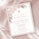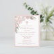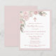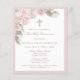 Elegante y femenina invitación para Primera Comunión con hermosas rosas rosadas en medio de un suave follaje verde. Las rosas y las hojas tienen detalles brillantes para agregar un toque de brillo. Todo el texto es editable para que puedas usarlo también para cualquier tipo de ceremonia religiosa, Bautizo, Bautismo, Dedicación o Confirmación.