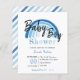 Una invitación a Baby Shower de Baby Boy con un buen presupuesto. En un fondo abstracto de banda de arco iris de tono azul, el texto de la tipografía negra dice Baby Boy Shower. Personalice agregando todos los detalles del evento y del contacto.