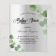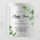 Una moderna y elegante invitación a bañarse en una ducha neutra de género. Fondo de aspecto metálico de color plateado falso decorado con vegetación eucaliptus, brotes. Personalice y agregue un nombre y detalles del fiesta. Letras de color negro.