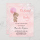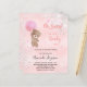 Para una ducha de bebé celebrando a una niña. Un fondo rosado falso metálico, con polvo falso purpurina plateado. Un oso de peluche sostiene un globo rosado. Personalice y agregue el nombre de la futura madre y los detalles del fiesta. ¡Oh bebé! y Bearly están escritos con un guión de estilo escrito a mano.