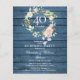 Con una delicada guirnalda floral de acuarela sobre un fondo de paneles de madera rústica azul, esta elegante invitación botánica de sorpresa para el 40 aniversario de bodas se puede personalizar con la información de su aniversario rubí especial. El reverso presenta una guirnalda floral a juego que enmarca las fechas del aniversario en elegante texto blanco sobre un fondo rubí. Diseñado por Thisisnotme©