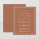 Una sencilla invitación a bodas con un diseño moderno y elegante, con su monograma de dos letras en la parte superior, un diseño de fecha audaz y sus detalles rodeados de un delgado borde. Todos los elementos de diseño están en blanco sobre un fondo de terracota / naranja quemado / óxido y pueden cambiarse en la herramienta de edición de diseño. Una moda y un diseño de diseño, ideal para una pareja minimalista.