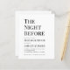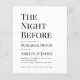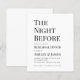Una invitación simple y minimalista en negro y blanco para la cena de ensayo. Solo tiene texto negro sobre fondo blanco. El título "La noche antes", la ocasión "Cena de ensayo" y el nombre están escritos en mayúsculas grandes, el resto en minúsculas. El texto está alineado a la izquierda.