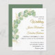 Estas invitaciones a bodas de bajo presupuesto con agua eucalipto verde y textos en negro y oro sobre fondo blanco son elegantes y únicos. El texto de la plantilla facilita la personalización.