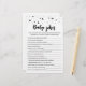 Compra este juego y disfruta de una tarjeta de Chiste Baby de alta calidad para tu evento! Diseño de estrellas blancas y negras neutras en cuanto a género. RESPUESTAS: 1.Una infantería 2.Una pequeña freidora 3.Ella va a tener a su bebé en la primavera 4.Ella le envió un correo electrónico 5.En un bajito 6.Cualquier cosa que quieras 7.Dije que no, 40 bebés son suficientes 8.No si cambias el pañal del bebé rápidamente 9.El bebé no puede llevar a la madre 10. ¿Dónde está Pop Corn? 11. Ella le dijo que recogiera un monitor de bebé 12. ¿Por qué no? 13.Un niño 14.Tiene un ganado 15.Si llora es un niño. Si llora, es una chica