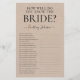 Esta encantadora hoja de juego de despedida de soltera ¿Cuánto conoces a la novia? es simple y encantadora, perfecta para cualquier celebración. Este juego divertido y fácil seguramente traerá muchas risas a cualquier despedida de soltera. Simplemente dé una hoja a cada invitado (no olvide los bolígrafos) y ¡que comience la diversión! Te sorprenderá cuántas personas conocen algunas de las respuestas.