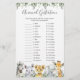 La tarjeta de juego de gestación animal con animales de bosque está decorada con la temática de los animales de madera con ducha de bebé y cuenta con un ilustracion de animales de safari acuarela y una vegetación acuarela con eucaliptos y un elegante tipo de letra manuscrita.