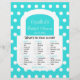 ¿Necesitas un juego de fiesta de despedida de soltera "¿Qué hay en tu bolso?" Bueno, este es uno divertido. El diseño presenta un bolso blanco lindo con un fondo azul turquesa en el que aparecen lunares blancos. El juego "¿Qué hay en tu bolso?" tiene diferentes valores de puntos para diferentes artículos y luego un lugar para el total de puntos. Incluso puedes personalizar el juego con el nombre de la novia y la fecha. Este es un juego divertido para hacer que todos sonrían en la despedida de soltera. Copyright henishouseofpaper
