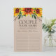 Este encantador y rústico girasol juego de matrimonio LGBTQ Couple Name o hoja de juego de ducha para parejas es elegante y encantador - perfecto para cualquier boda de jardín, botánica, rústica, romántica, floral, formal o vintage. Su exquisita combinación de exquisitos girasoles acuáticos de varios matices y una vegetación brillante es florida, delicada y hermosa. Este juego divertido y fácil seguro traerá muchas risas a cualquier ducha. Simplemente dé una hoja a cada invitado (no se olviden de los bolígrafos) y deje que empiece la diversión! Te sorprenderás de cuántas personas se les ocurra hablar con palabras largas usando los nombres de la pareja feliz. Para hacerlo propio, simplemente seleccione Personalizar esta plantilla y escriba los nombres de los matrimonios.