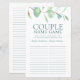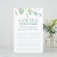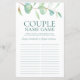 Esta hoja de juego de nombres para parejas LGBTQ de eucalipto botánico traerá mucha diversión y risas a tu fiesta de regalos. La página es elegante y moderna. Su hermoso diseño con una pieza de eucalipto en estilo acuarela contemporáneo es perfecto para cualquier boda. Para personalizar este juego, simplemente selecciona Personalizar esta plantilla y escribe los nombres de la feliz pareja.