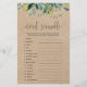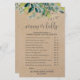 Este juego de "mamá o papá" con temática kraft es perfecto para una fiesta de bebé rústica. La parte frontal de la tarjeta del juego presenta "¿mamá o papá?", y la parte trasera de la tarjeta presenta "rompecabezas de palabras de bebé". El diseño cuenta con un marco de hojas verdes y elementos botánicos de follaje en un fondo de papel kraft falso. Personalice la parte frontal de la tarjeta con el nombre de la futura mamá y la fecha de la fiesta de bebé. Puede personalizar las preguntas del juego haciendo clic en el botón "personalizar".