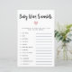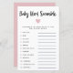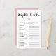 Tarjeta de rompecabezas de palabras con chica simple y moderna con un corazón rosa. La lista de palabras de esta tarjeta están todas relacionadas con bebés y están revueltos. ¡Los clientes competirán para que puedan desentrañar todos ellos primero! LLAVE DE RESPUESTA: 1. asiento de coche 2. leche 3. bolígrafo de reproducción 4. pacificador 5. pañal 6. mecedora 7. vivero 8. monitor de bebé 9. taladro 10. fórmula 11. ducado de goma 12. acolchador.