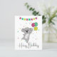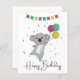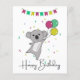 Cumpleaños saludando Feliz Cumpleaños con globos y koala para el cumpleaños de los niños. Una tarjeta divertida y colorida para el cumpleaños de un niño. Para los amigos que aman a koalas.