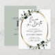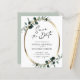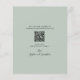 Presupuesto Eucalyptus Oro Caligrafía moderna QR Código Boda blanca y sabia Guardar la fecha... Nuestra asequible tarjeta Save the Date botánica cuenta con un falso marco óvalo metálico dorado adornado con hojas de eucalipto verde polvoriento y de color esmeralda, creando un borde natural para el texto de invitación dentro. La parte posterior verde de la tarjeta contiene la información del sitio web de su boda y un ejemplo de gráfico de código QR que puede reemplazar simplemente introduciendo la dirección URL de su sitio web boda en la plantilla. Todos los ejemplos de texto en ambos lados de la tarjeta (aparte de los elementos caligráficos) se pueden revisar fácilmente con sus propios detalles en la misma plantilla de personalización.
