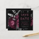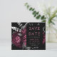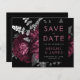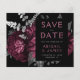 Esta elegante boda monónica Save the Date incluye un exuberante y romántico ramo floral de rojo burdeos con Relieve metalizado falso plateado y follaje purpurina sobre un fondo negro. Personalizar el texto gris plateado y burdeos pálidos en fuentes elegantes en un rectángulo negro, y agrega la URL de tu sitio web boda a la espalda negra sólida.