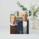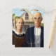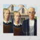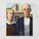 Este es el clásico cuadro de Grant Wood, American Gothic, mostrando a un granjero y a su esposa parados frente a su casa de campo, él con su horquilla, ella mirándole a los lados.
