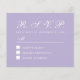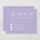 Un presupuesto simple y minimalista para un boda. Sólo tiene texto blanco sobre fondo de lavanda (púrpura). El título RSVP y la letra M están escritos en un guión caligráfico elegante, el resto en mayúsculas.