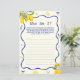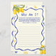 Añade algo de diversión a tu tema principal de la ducha de novia con este juego personalizado de adivina quién! Con un encantador diseño de limón, este juego es perfecto para una celebración de limón con ducha de novia. Es una gran adición a un tema de ducha de limón, que trae risas y recuerdos a tu evento. Ideal para aquellos que buscan ideas de ducha de novia con tema de limón y ideas de ducha de novia con tema italiano de limón, este juego es imprescindible para las ideas de ducha de novias de verano.