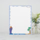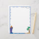 Este membrete vacacional tiene un borde azul claro, una isla con palmeras en la esquina inferior derecha y un gran crucero azul en la esquina inferior izquierda.