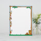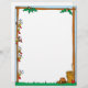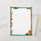 Este divertido membrete de Acción de Gracias incluye un hacha y un bloque de corte en la esquina inferior derecha y varios pavos asomando por el lado izquierdo.