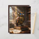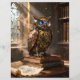 A clockwork owl with saphhire eyes is perched on a stack of books in an old library. Dust, or perhaps smoke from overheated servos, rises around it. Very nice steampunk image!