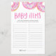 ¿Qué artículo de bebé comienza con cada carta? ¿Puedes adivinar qué escribió la futura mamá? | Añada esta tarjeta de juego de Baby Items divertidos a su ducha de bebé. Esta tarjeta de juego trivia con ducha para bebés cuenta con donuts de color rosa con salpicaduras de colores. Personalice agregando nombres, eventos y fecha. Este donuts rosados Baby Items es perfecto para cualquier temporada o tema de la ducha para bebés.