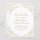 Esta elegante boda formal de inspiración vintage, salvo la tarjeta de fecha, incluye el texto en escritura de color oro y fuentes serif, enmarcado por un delicado motivo de vid de oro vintage. El marco se repite al revés.