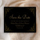 Esta elegante tarjeta formal de guardar la fecha de boda, inspirada en la vintage, presenta el texto en fuentes de escritura y serif de color dorado, enmarcado por un delicado motivo de viña dorada vintage sobre un fondo negro. El marco se repite en el reverso.