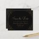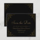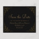 Esta elegante tarjeta de save the date de boda formal vintage inspira la tipografía en fuentes script y serif de color oro, enmarcada por un delicado motivo de viña dorada vintage sobre un fondo negro. El marco se repite en el reverso.