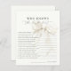Elegante tarjeta de juego con arco blanco de marfil "Who Knows the Bride Best" (Quién conoce a la mejor novia), que presenta tipografía con guión de moda en un fondo limpio. Perfecto para añadir un toque divertido e interactivo a una ducha de novia, una ducha de boda o una fiesta de soltera, especialmente para celebraciones con tema de arco o blanco y negro. Los huéspedes responden preguntas desenfadadas sobre la novia, lo que hace que sea un placer memorable. Coordina maravillosamente con invitaciones, señales y accesorios fiestas a juego en el mismo diseño de arco de marfil.