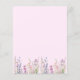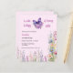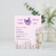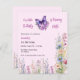 Una invitación para celebrar el primer cumpleaños de una niña. Un fondo rosa claro. Decorada con una mariposa morada, flores silvestres rosas, violetas y azules. Personaliza y agrega el nombre de la madre para ser y los detalles del fiesta. Texto: Nuestra mariposa pequeña está girando UNA. 1 hoja = 1 borde impreso de invitación a borde.