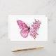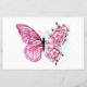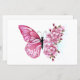 Arreglo floral de mariposa rosa con flores japonesas de cerezo rosadas sobre fondo blanco.