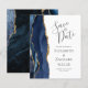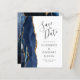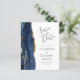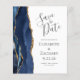 El borde izquierdo de esta elegante y moderna boda, salvo la tarjeta de fecha, cuenta con un borde de batido de color azul marino adornado con falso purpurina de oro. El texto del personalizable combina la escritura a mano de carbón gris, el copperplate y las fuentes cursivas en un fondo blanco. El reverso presenta un diseño de agate azul marino y oro a juego.