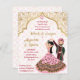 Mehndi sangeet boda indio de oro rosado invitación presupuestal con una linda pareja de novias hindúes bailando, marco de arco dorado, fondo de loto, Ganesha (puede reemplazar la foto con otro avatar si es necesario) , invitaciones impresas asequibles.