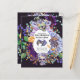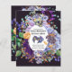 Calabazas, calaveras de colores naranja y morado, invitación económica de Halloween perfecta para cumpleaños, quinceañera y otros eventos como se desee. Añadir texto a ambos lados asegurando que se incluyen todos los detalles del fiesta, registro de regalos, rsvp, código de vestimenta.