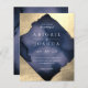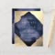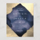 Elegantes invitaciones a bodas con una acuarela de color marino con forma de diamante y esquinas de Relieve metalizado dorado con champán. Sus detalles se muestran con una tipografía elegante y elegante que combina secuencias de comandos y fuentes serif. Como parte de la selección del presupuesto en Zazzle, estas invitaciones vienen en tamaños limitados y reservas de papel. Si necesita un tamaño o material de papel diferente, este diseño se puede transferir a un formato estándar 5x7 utilizando la herramienta de transferencia de diseño para más opciones.