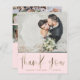 Esta elegante tarjeta de agradecimiento nupcial incluye lujosa caligrafía en oro falso sobre un suave fondo rosa rubor, acompañada de espacio para destacar cinco de tus fotos favoritas de bodas. Un diseño moderno pero romántico de dos lados, es la manera perfecta de compartir recuerdos de tu gran día mientras expresas sincera gratitud a amigos y familia. Personalizable total con sus propias imágenes y mensajes, esta tarjeta de agradecimiento de color negro y dorado hace un toque eterno. Ideal para tarjetas de agradecimiento para novios, papel fotográfico para bodas o notas postbodas personalizadas.
