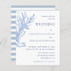 Crea invitaciones de boda económicas para eventos de playa que presentan un diseño moderno azul y blanco, decorado con cuadros de algas acuáticas en la parte delantera y el patrón de rayas en la parte trasera. Es una buena idea para los bodas de la costa y del mar. Utilice la plantilla para personalizar las invitaciones de boda con sus nombres, ubicación y lugar.
