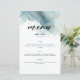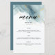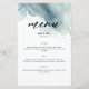 Un menú boda con temática playera que se caracteriza por una acuarela abstracta pintada de una playa y olas con un efecto colorido de tinta dorada (el oro es un efecto digital, ¡no un Relieve metalizado real!) y caligrafía moderna. Elegante y elegante, sencillo y moderno, es una opción agradable para una boda playera en cualquier temporada, para una pareja moderna.